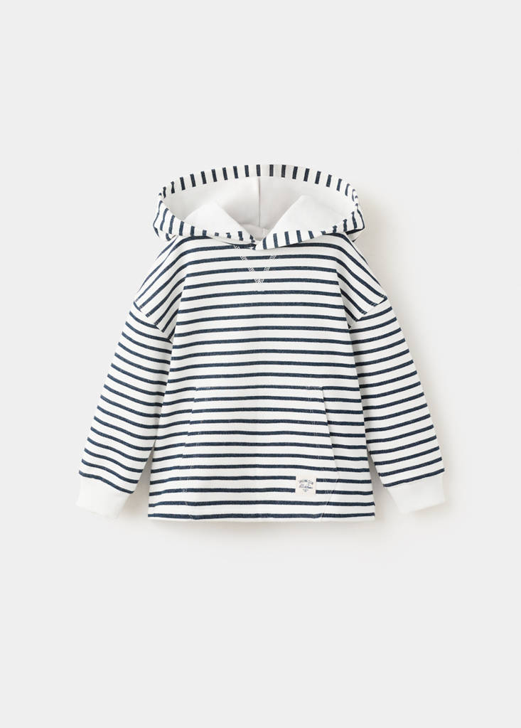 100% cotton fabric. Striped fabric. Straight design. Round neck. Hood. Long sleeves. Ribbed cuffs. Valentine Collection.