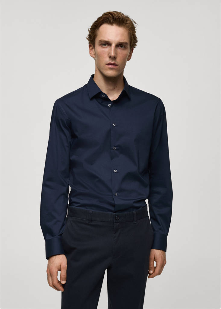 Regular-fit stretch cotton shirtCurrent price [Lek 4,990.00 ]Lek 4,990.00Select a colourDark NavyThe model is wearing size M and is 188cm tall.Select your sizeXSNot available. I want it!SNot available. I want it!MNot available. I want it!LNot available. I want it!XLNot available. I want it!XXLNot available. I want it!DimensionsNotify meAdd to WishlistSee lookFree delivery to storeThe colour brown is exclusive online. Regular fit. Slightly elastic cotton fabric. Long sleeves with buttoned cuffs. Rounded base. Front closure with buttons. Classic collarDetails, composition and careStore availability