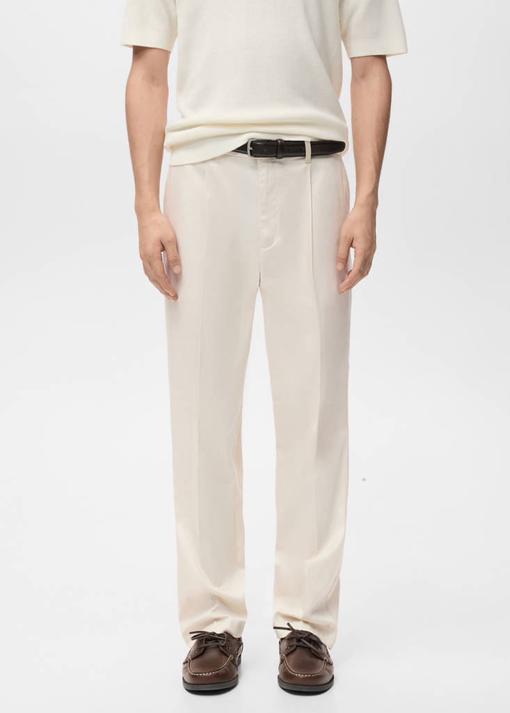 Regular-fit pleated flowy trousersCurrent price [Lek 7,490.00 ]Lek 7,490.00Select a colourBeigeThe model is wearing size 44 and is 186cm tall.Select your size3840424446Size guideAddAdd to your wishlistSee lookFree delivery to storeSee availability in storeDescriptionRegular fit. Cotton and lyocell-blend fabric. Front pleat detail. Two side pockets. Two welt pockets with button at the back. Front zipper and button closure. Belt loops.See detailsShare