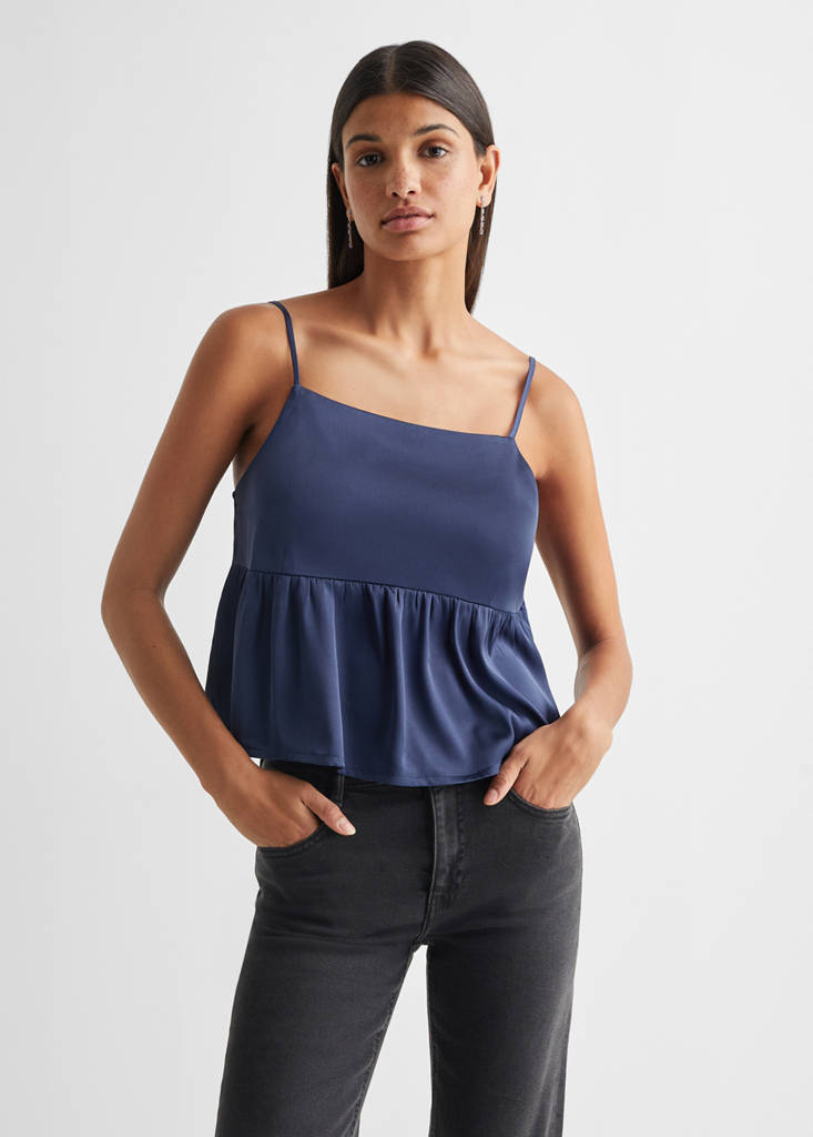 Party, ceremony and communion collection. Satin fabric. Ruffled design. Crop design. Thin straps. Adjustable straps. Square Neckline. Sleeveless