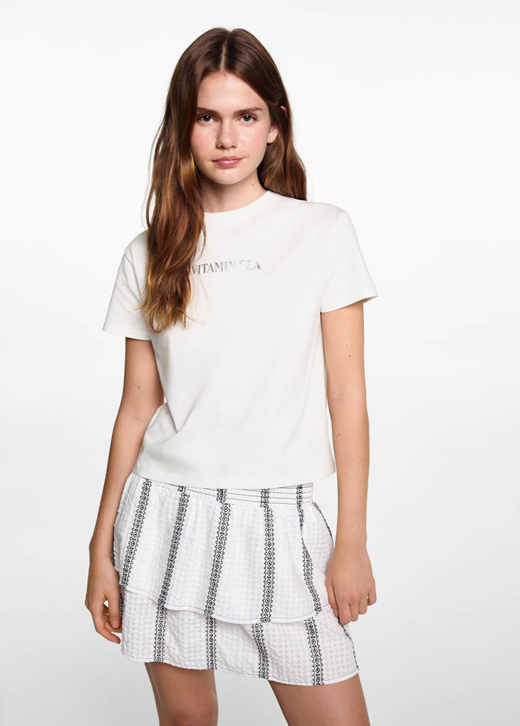 Printed design on the back. Straight design. Short sleeves. Round neck. No Fastening