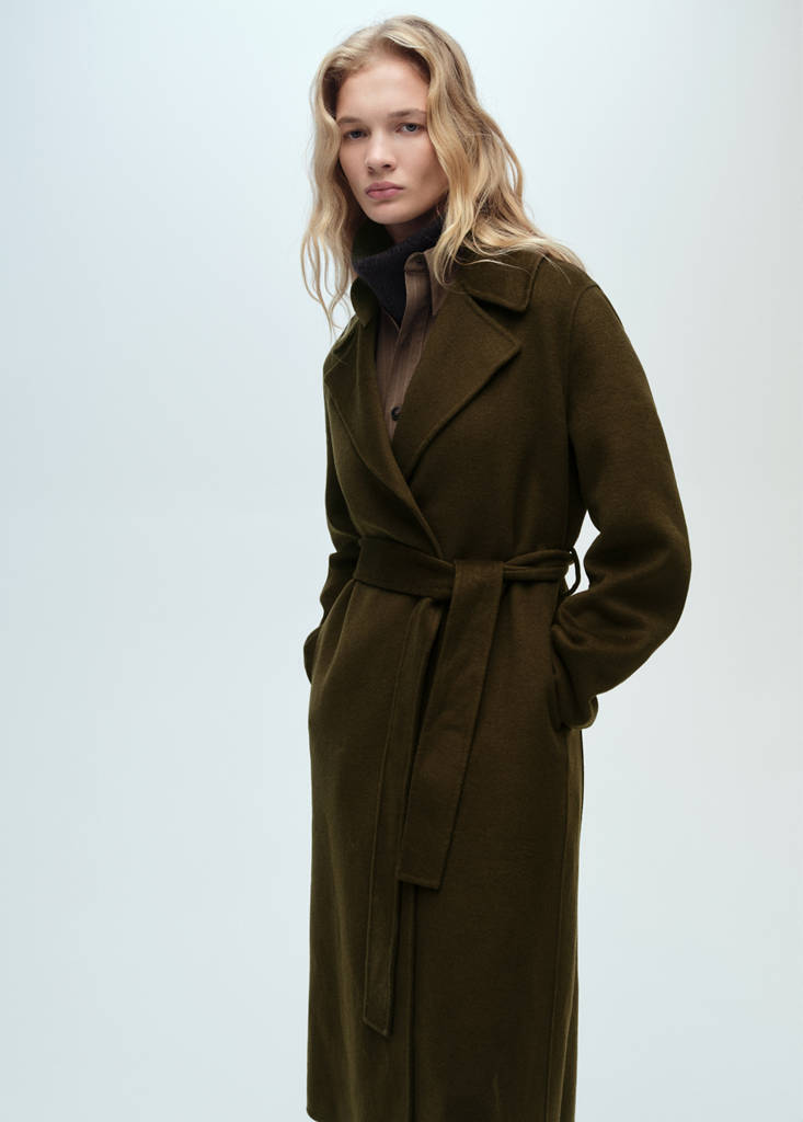 Recycled wool mix fabric. Oversized design. Medium design. Two front pockets. Lapel-collar V-neck collar. Long sleeves. Removable belt. Back vent at the hem. Office looks