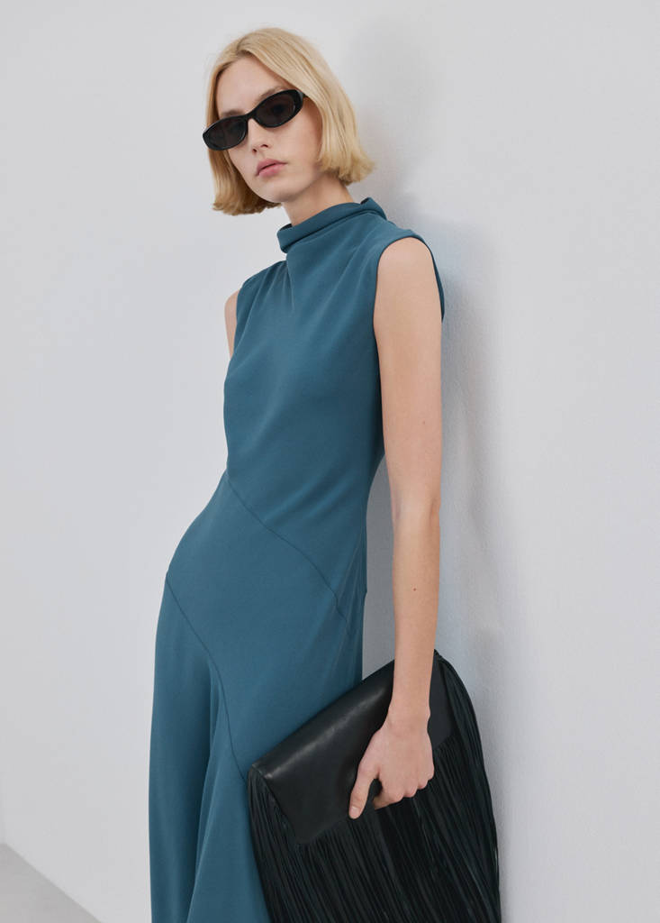 Long dress with draped neckCurrent price [Lek 7,490.00 ]Lek 7,490.00Select a colourBlueThe model is wearing size S and is 179cm tall.Select your sizeXSSMLXLDimensionsAddAdd to your wishlistSee lookFree delivery to storeLong design. Straight design. High draped neck. Short sleeves. Button closing on the neck. The blue colour is an online exclusiveDetails, composition and careStore availability