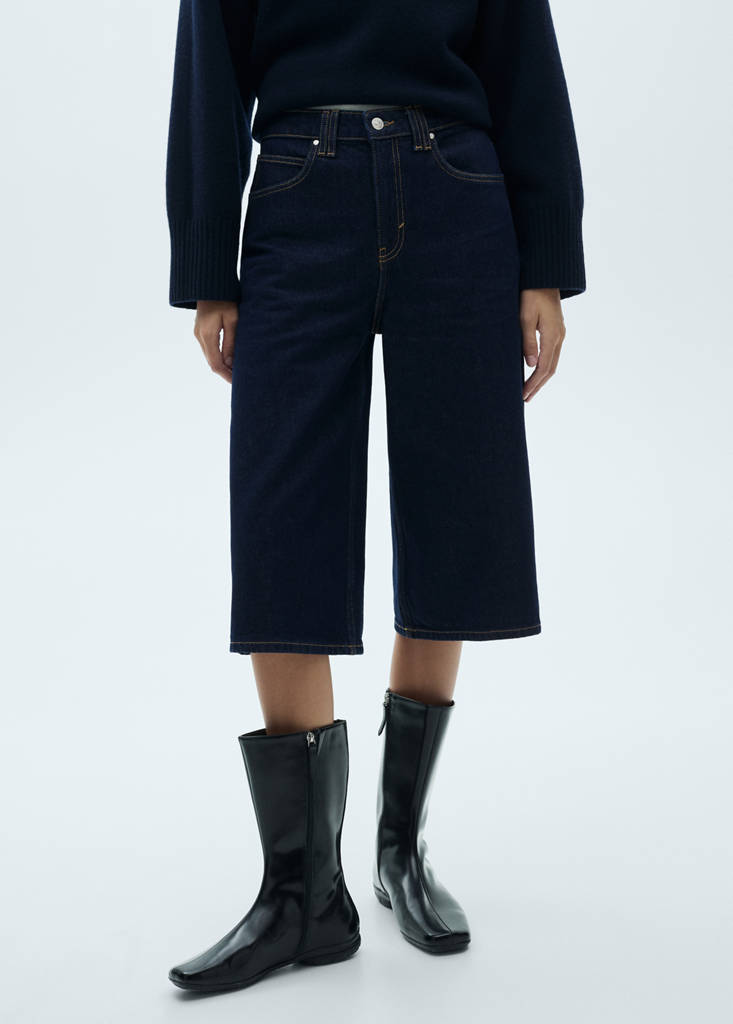Denim-style cotton fabric. Rinse wash. Midi design. Straight design. Mid-rise. Belt loops. Zip and button fastening. Five pockets.