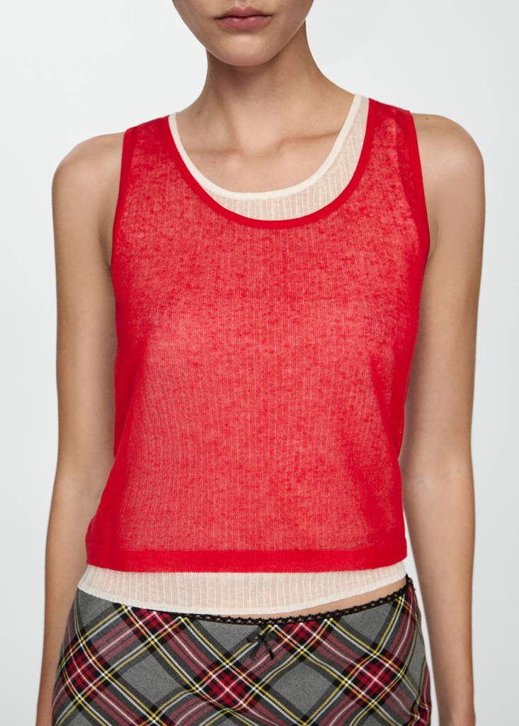 Fine knit fabric. Linen and lyocell blend fabric. Straight design. Combined design. Round neck. Sleeveless. Wide straps