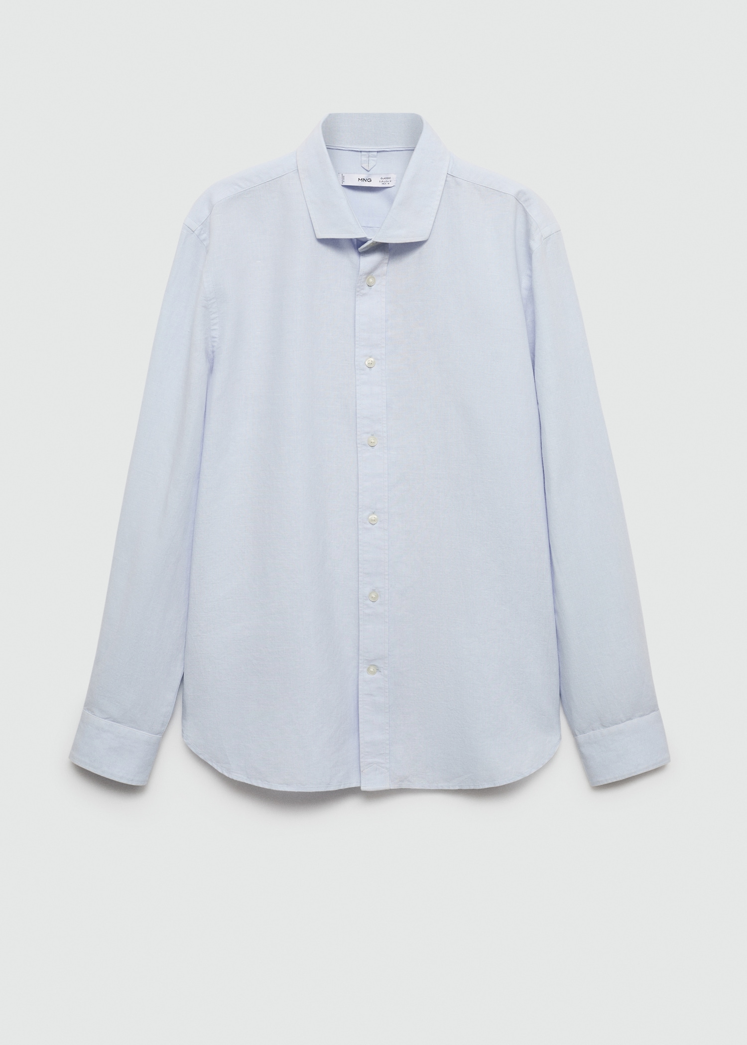 The aqua green model is an online exclusive. Cotton and linen blend fabric. Shirt Collar. Long sleeves with buttoned cuffs. Classic fit. Rounded base. Front closure with buttons.