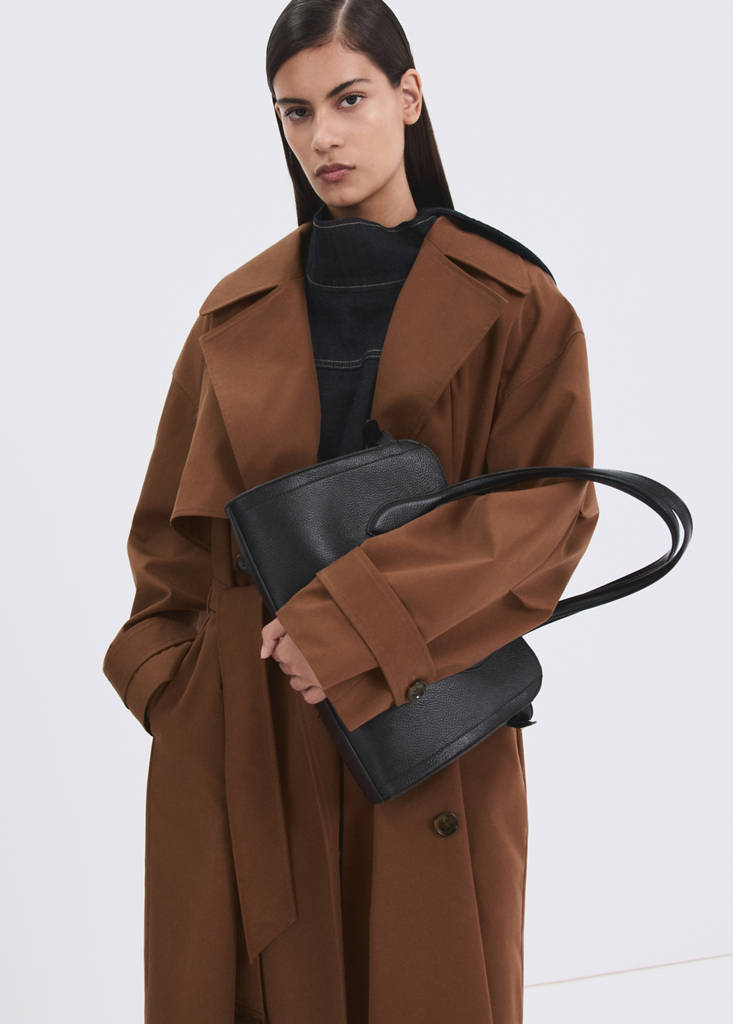 Cotton fabric. Long design. Straight design. Wide lapel collar. Long buttoned sleeves. Two side pockets. Removable belt. Double button fastening.