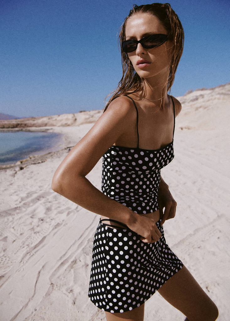 Stretch fabric. Straight design. Short design. Spots print. Total look. Online Exclusive