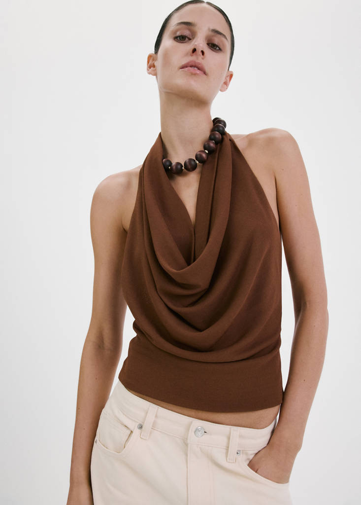Draped halter topCurrent price [AMD 12,900.00 ]AMD 12,900.00Select a colourBrownThe model is wearing size S and is 178cm tall.Select your sizeXSSMLXLSize guideAdd to WishlistSee lookFree delivery to storeSee availability in storeDescriptionStraight design. Halter neck. Draped neckline. Sleeveless. Open back. No Fastening.See detailsShare