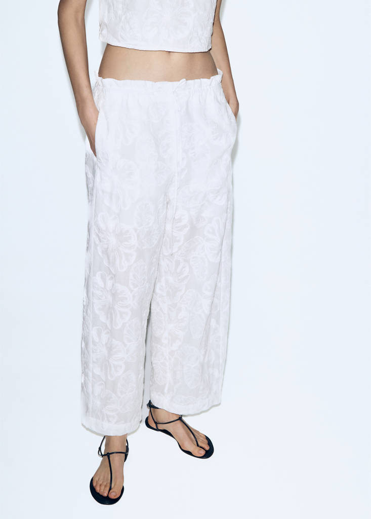 100% cotton fabric. Straight design. Long design. Adjustable Elastic Waistband. Side pockets. Inner lining. Embroidered floral details. Total look