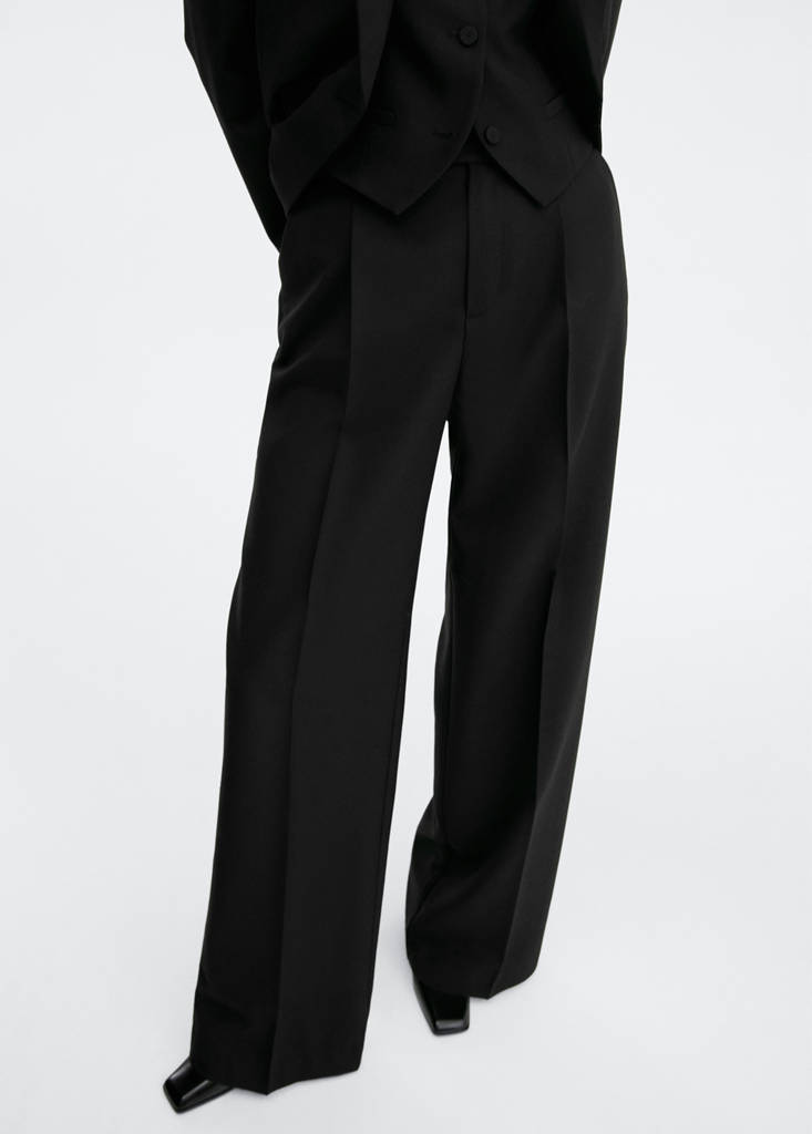 Wool mix fabric. Wide-leg design. Front pleat detail. Two side pockets. Belt loops. Zip and hook fastening. Inner lining. Office looks. Selection Collection