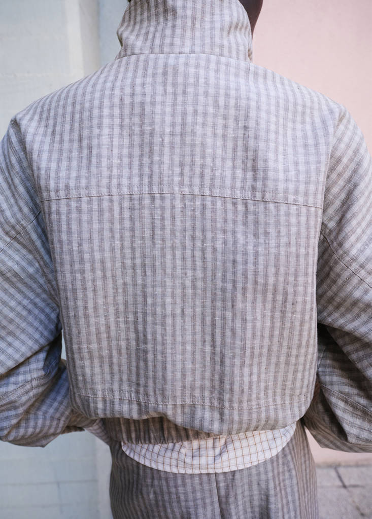 Ткань смесь хлопка и льна. Оверсайз дизайн. Принт: Клетка. Воротник-воронка. Два боковых кармана с клапанами. Спереди застежка на молнию. Total look. Эксклюзивно онлайн.