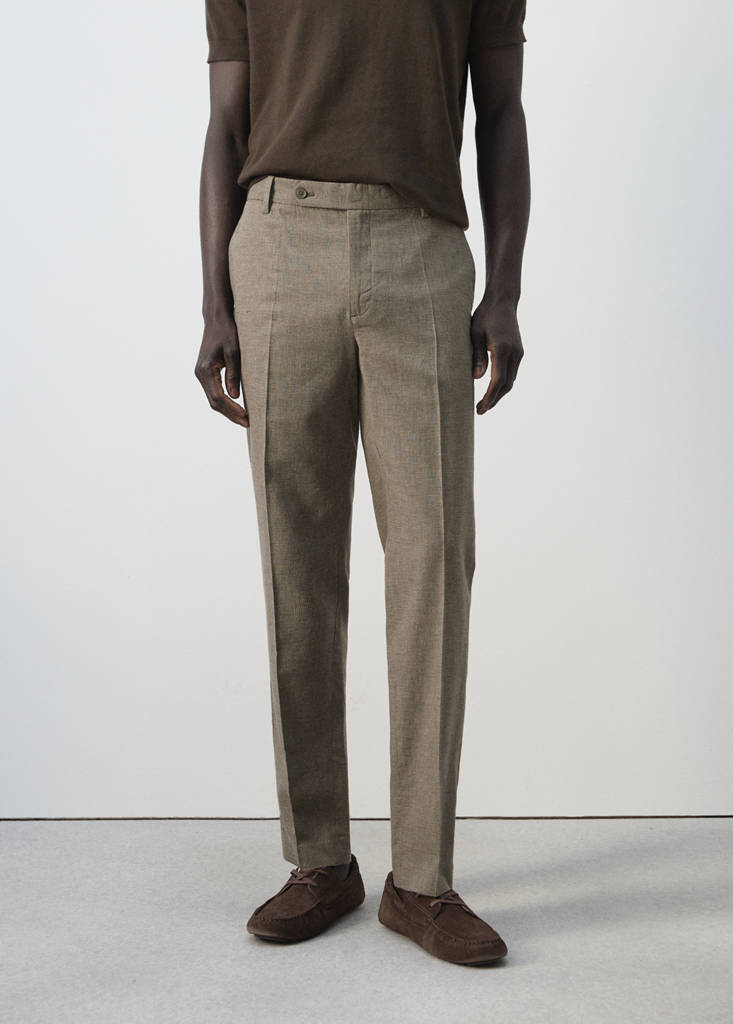 ESSENTIALS: Сделано, чтобы служить долго. Эксклюзивно онлайн. Прямой крой. Стандартная длина. Ткань из смеси льна и хлопка. Узор "куриная лапка". Шлёвки для ремня. Перекрещенная талия. Застежка на пуговицы, крючок и молнию. Карман для монет. Два боковых прорезных кармана. Два задних кармана с клапаном и пуговицей. Деталь с отутюженной стрелкой спереди и сзади.