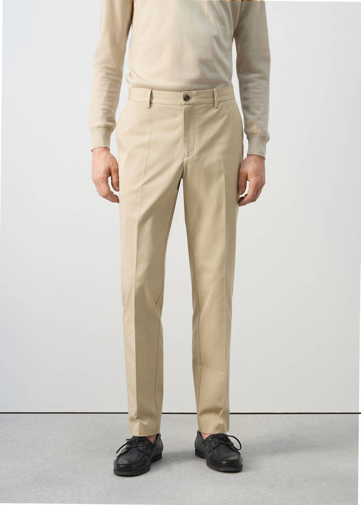 Slim fit. Хлопковая ткань. Стиль чинос. Шлёвки для ремня. Передняя застежка на двойные пуговицы и молнию. Спереди два кармана. В правом кармане есть отделение для монет. Два задних кармана с кантом.