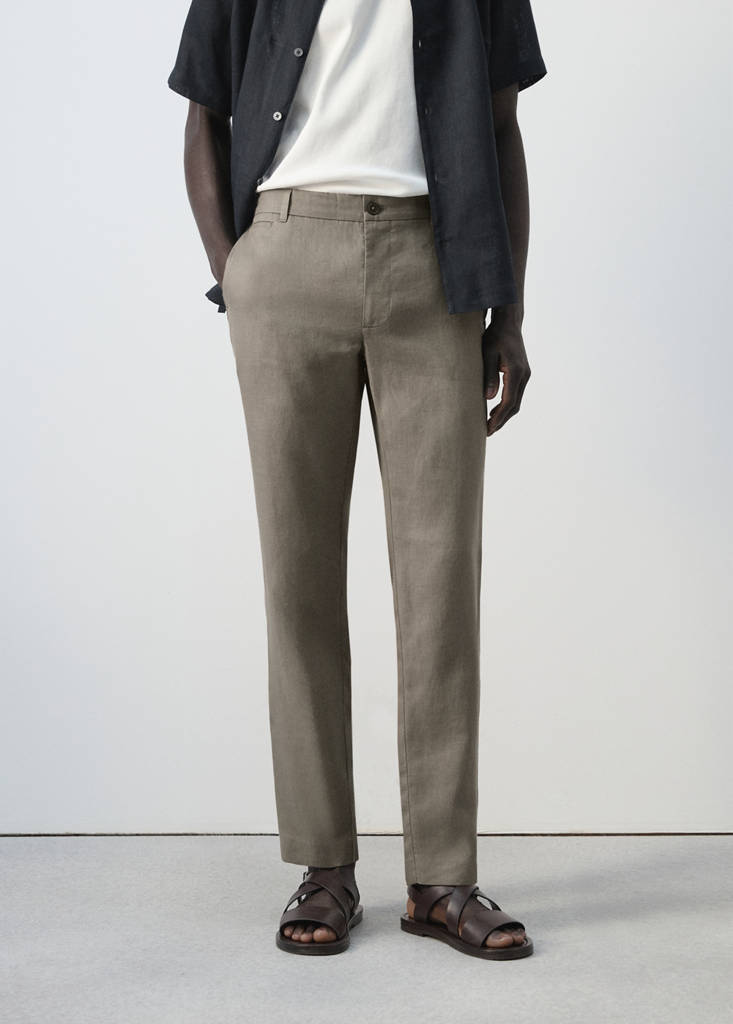 ESSENTIALS: Сделано, чтобы служить долго. Молочно-белый цвет эксклюзивно онлайн. Ткань: 100% лен. Силуэт Slim. Двойная застежка на пуговицу и молнию. Шлёвки для ремня. Два боковых кармана. Карман для монет. Два прорезных кармана с пуговицей сзади. Синий цвет доступен только онлайн. Коллекция Casper Ruud x Mango.