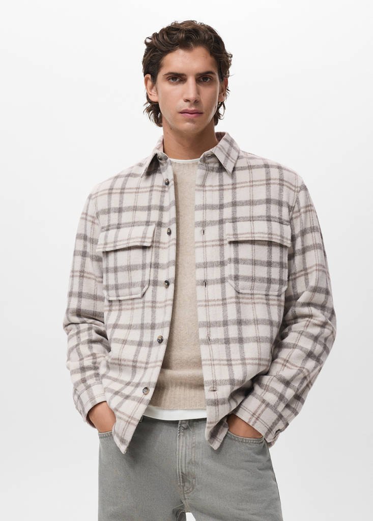 Фланелевая ткань. Дизайн в клетку. Спереди два кармана с клапанами и пуговицами. Манжеты на пуговицах. Рубашечный воротник. Закругленный низ. Застежка на пуговицы.