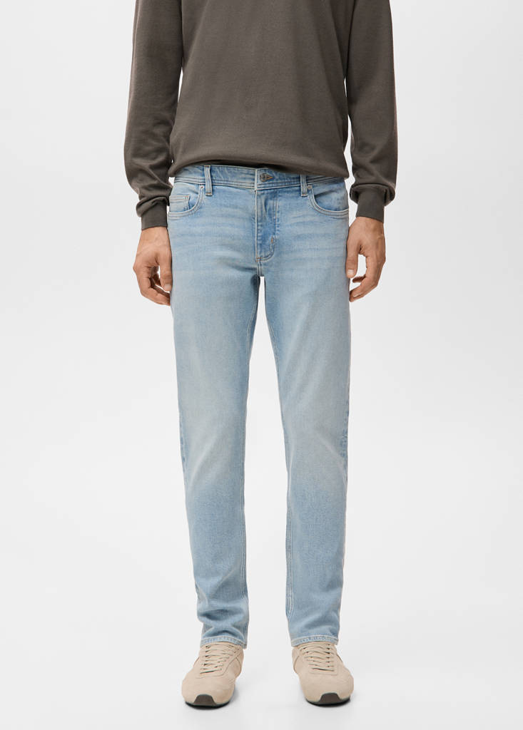 Slim fit. Хлопковая ткань. Светлый цвет с эффектом потертости. Карман для монет. Два передних кармана. Два накладных кармана сзади. Застежка на пуговицу и молнию. Хлопковая ткань в стиле джинсовой ткани. Стиль джинсов. Боковые карманы. Пять карманов. Стандартная длина. Силуэт Slim. Посадка на талии Regular Waist.