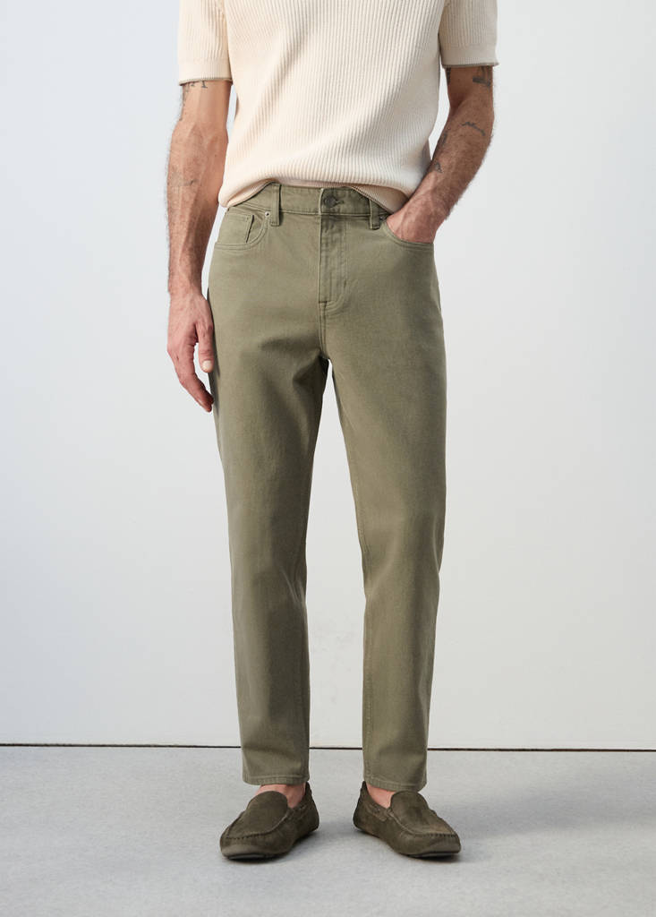 Tapered fit: свободные штанины, зауженные от колена до щиколотки. Кроп-дизайн. Хлопковая ткань в стиле джинсовой ткани. Шлёвки для ремня. Застежка на пуговицу и молнию. Два боковых кармана. Карман для монет. Два накладных кармана сзади.