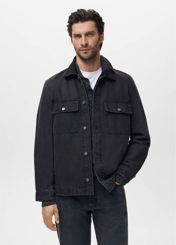Ткань 100% хлопок. Прямой силуэт. Эффект денима. Темный цвет. На груди два накладных кармана с клапаном и пуговицей. Внутренний карман. Рубашечный воротник. Застежка на пуговицы. Длинные рукава с застежкой на пуговицы.