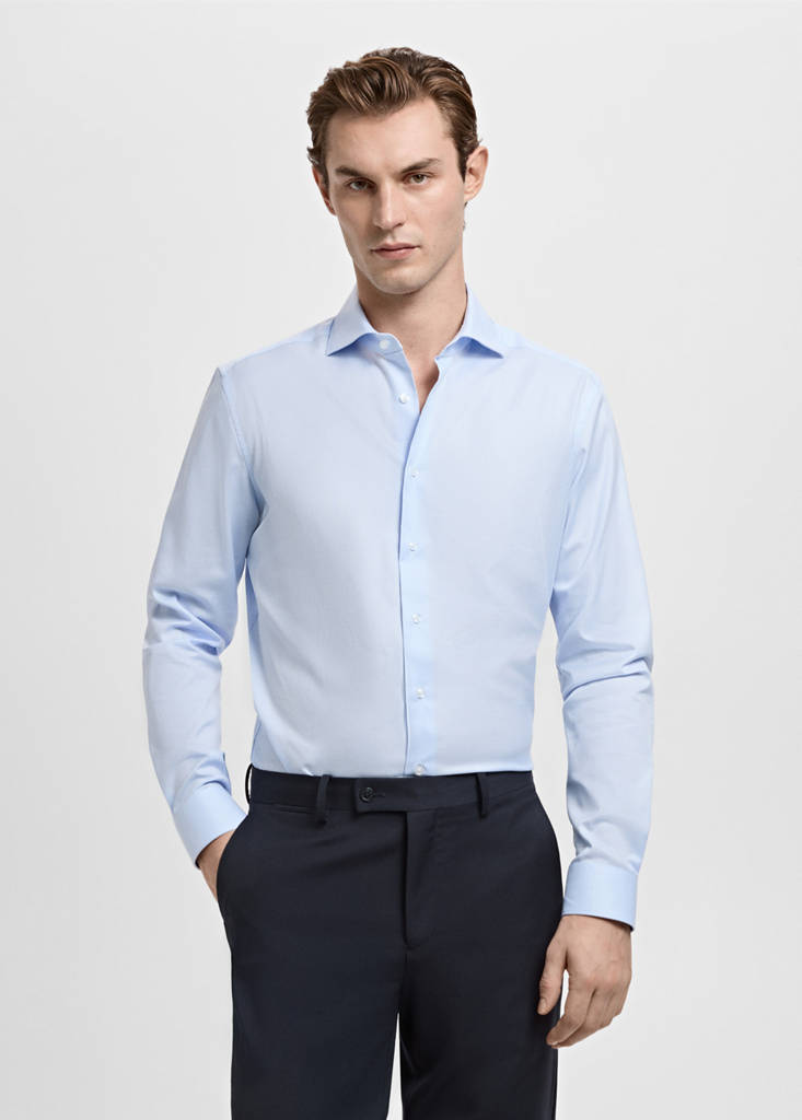 Slim fit. Ткань 100% хлопок. Структурный твил из хлопка. Принт в мельчайшую куриную лапку. Воротник "Акула". Передняя застежка на пуговицы. Длинные рукава с застежкой на пуговицы. Закругленный низ.