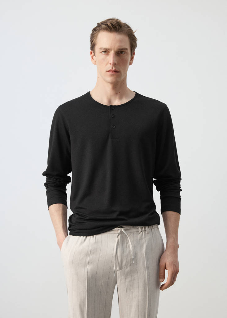Стиль хенли. Slim fit. Круглый вырез горловины с застежкой на пуговицы. Длинные рукава. Прямой низ.