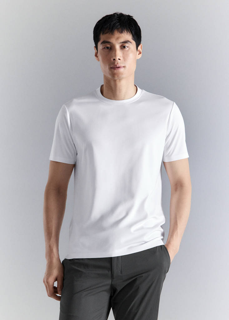 Коллекция Performance. Comfort Stretch: эластичная ткань, обеспечивающая дополнительный комфорт. Силуэт Slim. Прямой крой. Стандартная длина. Круглый вырез. Короткий рукав с термозапечаткой. Низ с термопроклеенными швами и двумя боковыми разрезами.