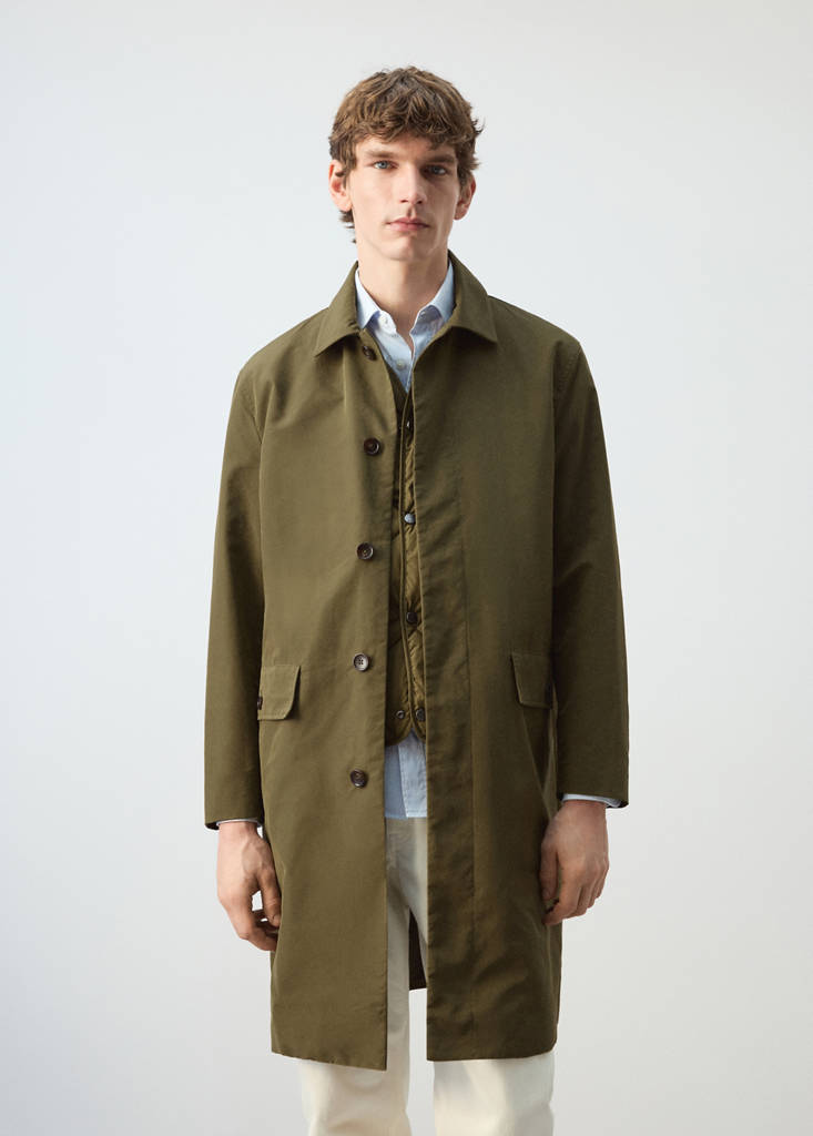 Водоотталкивающая: Прочное покрытие этого изделия защищает от легкого дождя, отталкивая воду и капли дождя. Внутри съемный стеганый жилет. Прямой крой. Рубашечный воротник. Два передних кармана с клапанами и пуговицами. Внутренний карман. Потайная застежка на пуговицы. Задний разрез внизу. Подкладка.