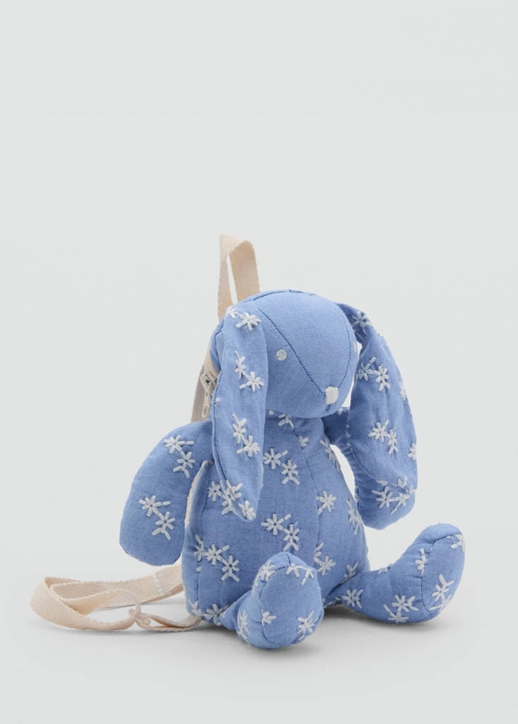 100% Algodão. Desenho de coelhinho. Bordado floral. Duas alças ajustáveis. Alça de mão. Fecho de fecho éclair