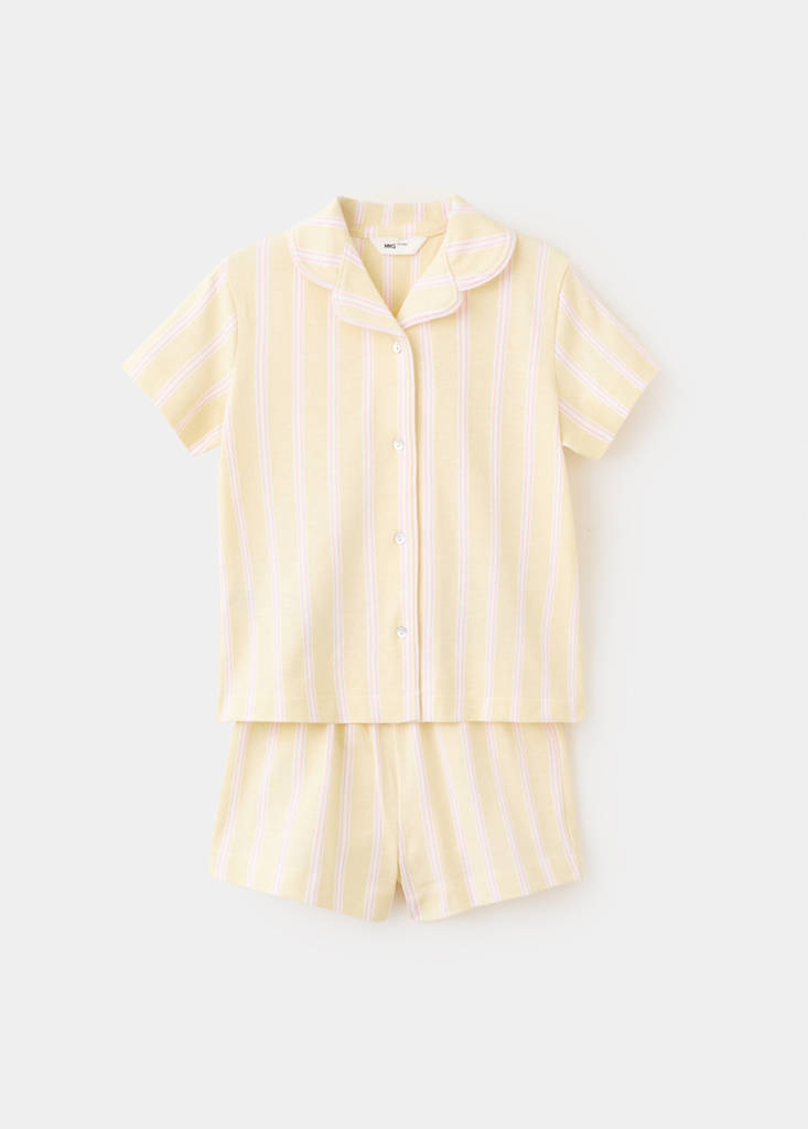 Pack de t-shirt de manga curta e calções de pijama. Tecido 100% algodão. Design de riscas. Gola de camisa. Manga curta. Cintura elástica. Calças curtas. Detalhe de riscas em contraste