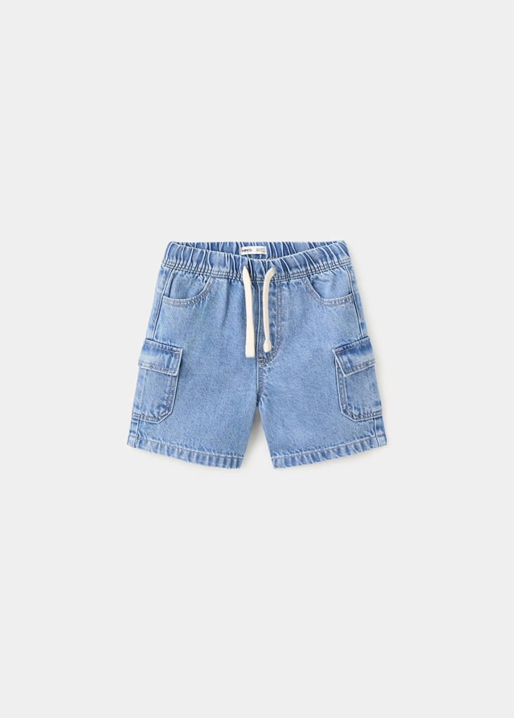 Tecido de algodão estilo denim. Design reto. Design curto. Dois bolsos laterais. Dois bolsos cargo. Cintura com elástico. Cordão ajustável na cintura