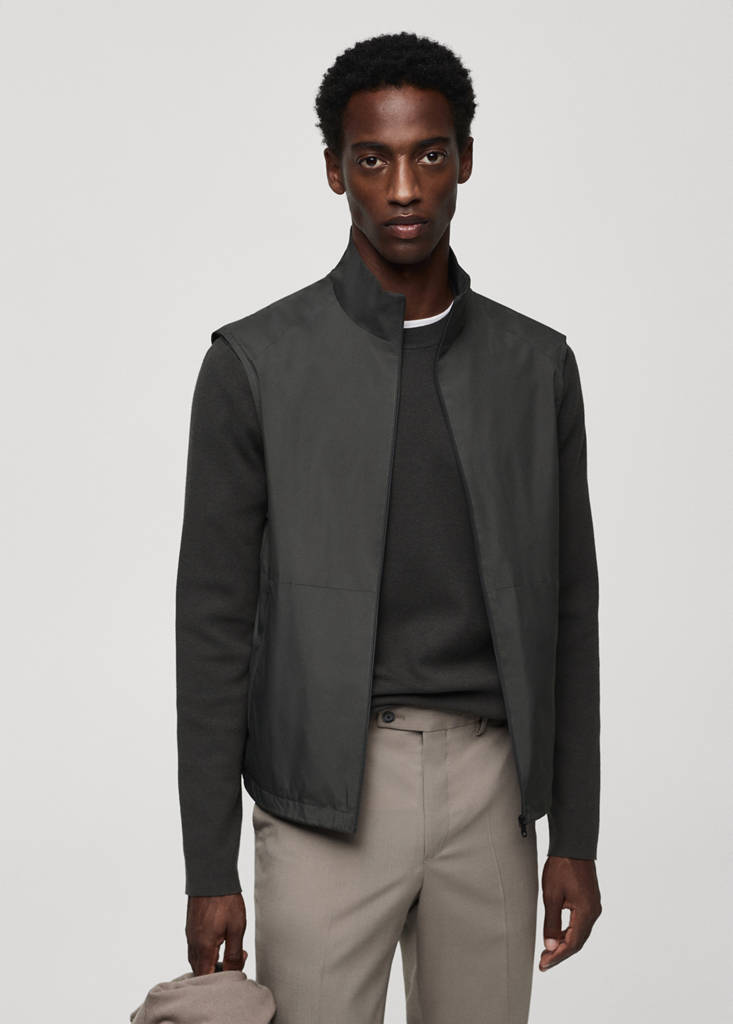 Coleção Performance. Tecido com proteção UV. Gola alta. Sem mangas. Fecho de correr à frente. Dois bolsos à frente com debrum e fecho de correr. Bolso interior de fecho de correr. Base com elástico. À prova de vento: Este material durável oferece proteção contra o vento para um maior conforto no estilo de vida ao ar livre. Repelente de água: O acabamento durável desta peça protege da chuva ligeira, repelindo o contacto com a água e as gotas de chuva