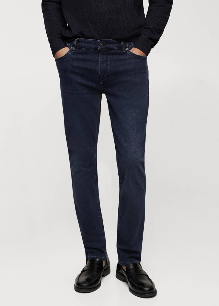 Corte skinny: o tipo de jeans mais ajustado. Tecido de algodão. Estilo de calças de ganga. Cor azul-escura. Cintura média. Presilhas para cinto. Fecho de zíper e botão. Bolso porta-moedas. Dois bolsos de patch na parte de trás. Coleção de Básicos. Corte skinny. Design crop. Tecido de algodão sustentável. Tecido de algodão stretch. Passantes para cinto. Cinco bolsos