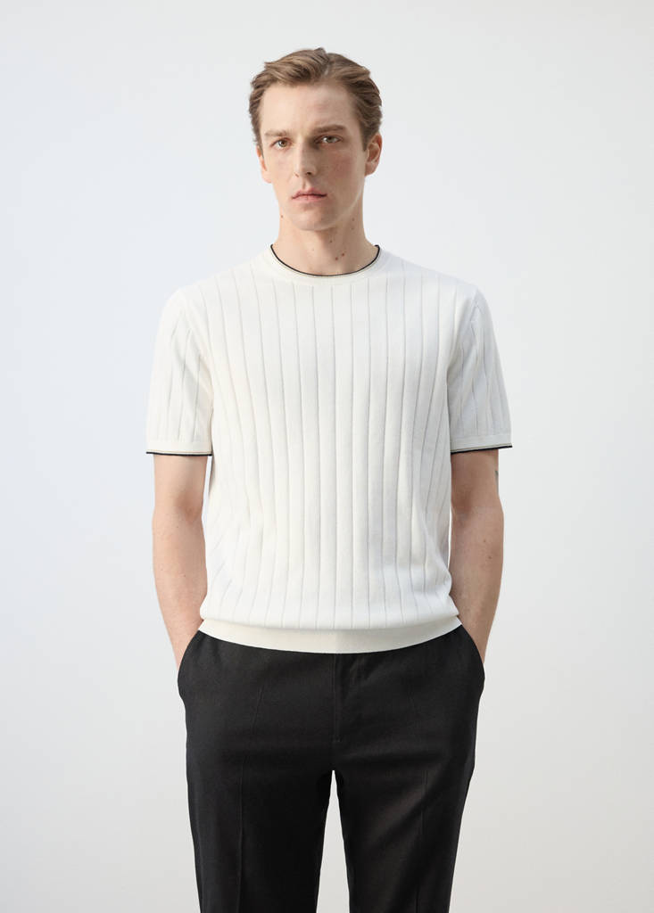 Corte regular. Tecido 100% algodão. Malha de tricô. Design de riscas. Gola redonda em contraste. Manga curta. Gola, mangas e base com acabamento canelado. Design reto. Estrutura de malha fina. Modelo Eco. Materiais sustentáveis. Temática MAIN-SUMMER NIGHT GREEN