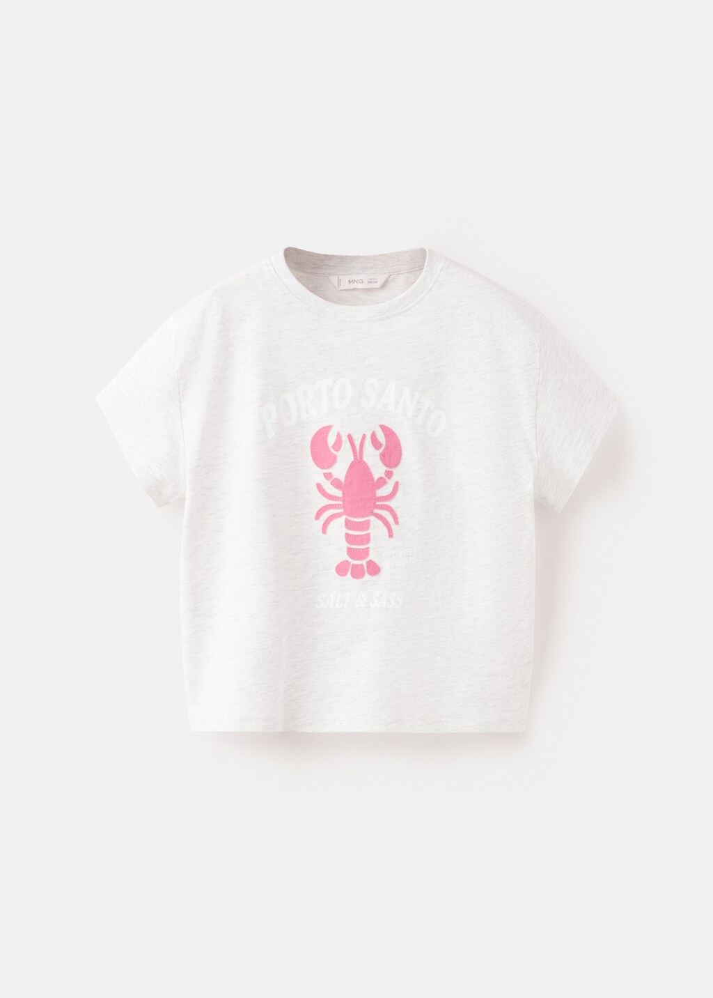 Tecido de algodão. Design reto. Gola redonda. Manga curta. Texto estampado no peito. Desenho de lagosta bordado no peito.
