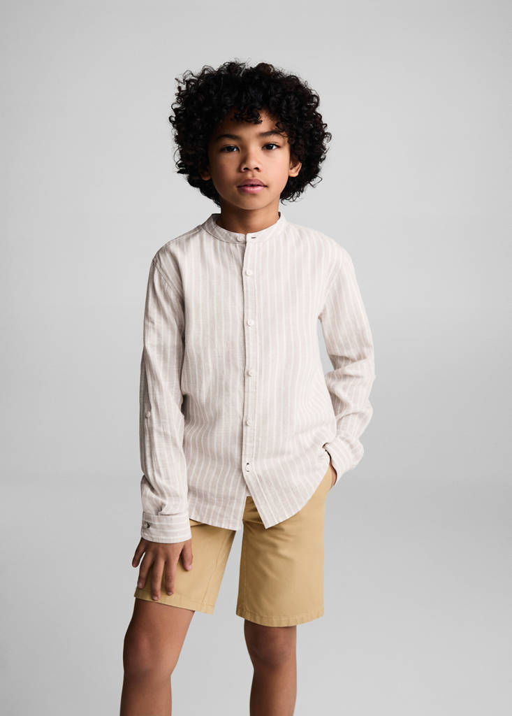 Camisa de linho às riscas com gola de mandarim