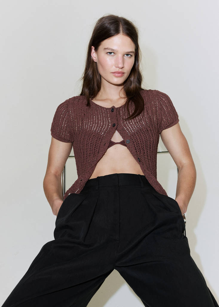Tecido de lyocell. Design reto. Pormenor de pinças. Cintura média. Dois bolsos laterais. Fecho de correr, botão e ganchos ocultos com carcela. Total look