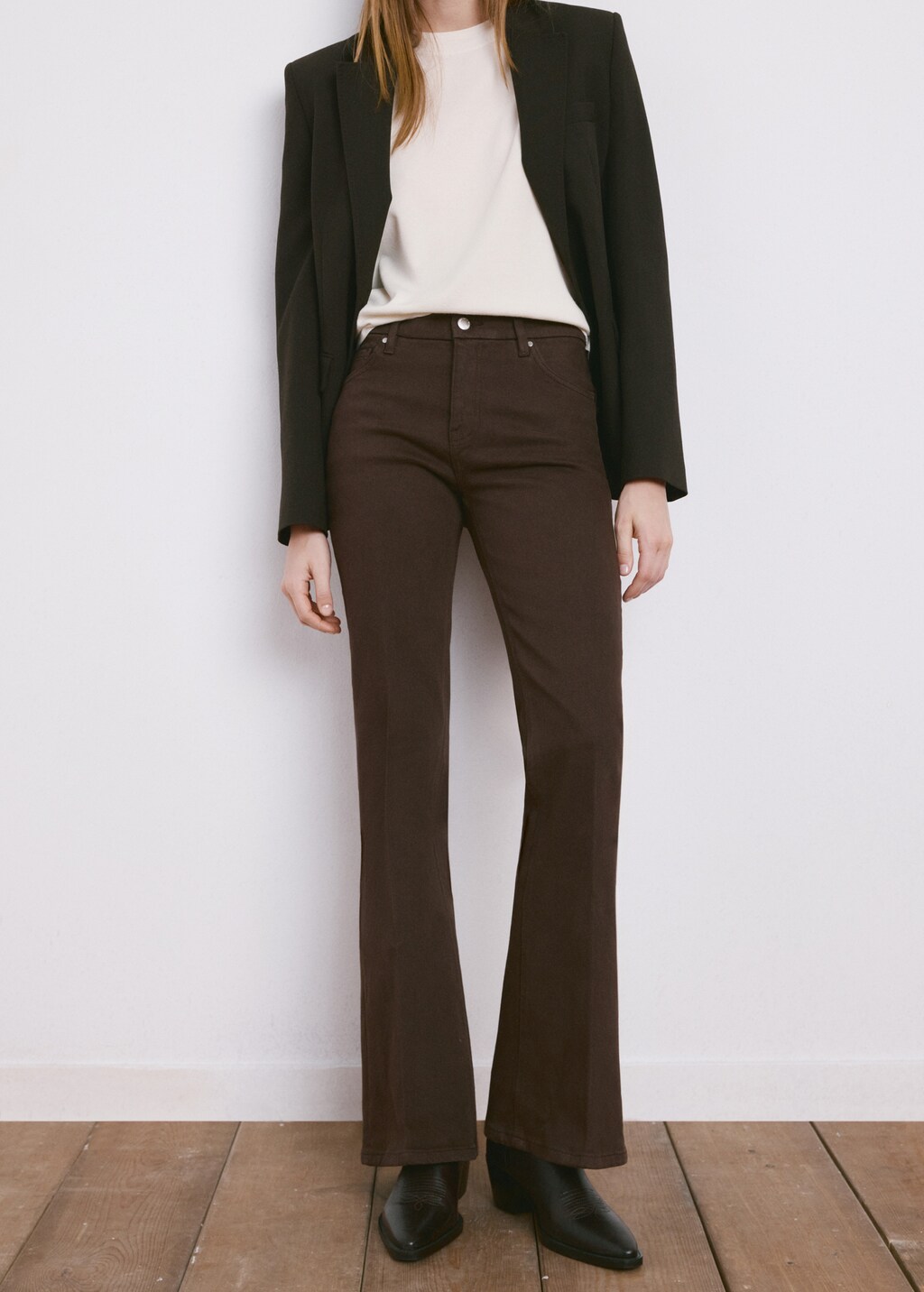 Tecido de algodão estilo denim cowboy. Tecido elástico. Design longo. Estilo boca de sino. Cintura alta. Cinco bolsos. Fecho de correr e botão à frente. Comprimento interior: 87,5 cm.