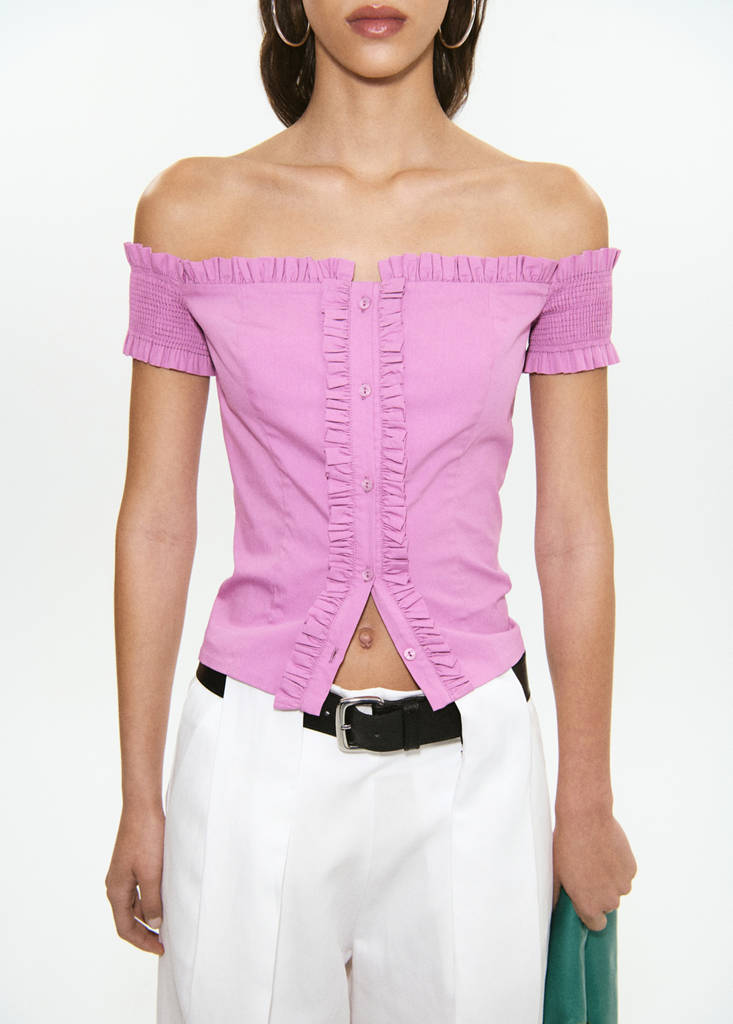Tecido misto de algodão. Tecido com elasticidade. Design ajustado. Design crop. Decote caicai. Manga curta. Fecho frontal com botões. Pormenor franzido na manga. Detalhe de folhos