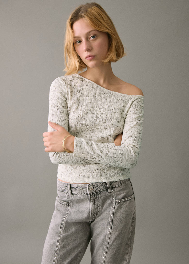 Com um tecido rufado de cor mesclada, esta peça apresenta corte reto, gola assimétrica e manga comprida. Faz parte da Coleção de Festa, ideal para reuniões festivas e eventos de Natal