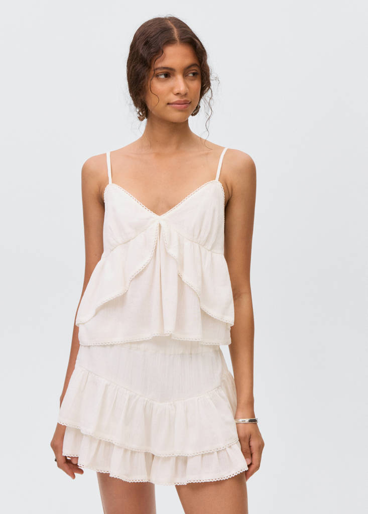 Top com folhos e pormenor de renda