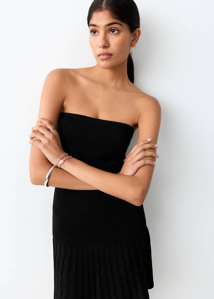 Tecido fluido. Design reto. Decote tomara que caia. Barra com babado. Sem fecho