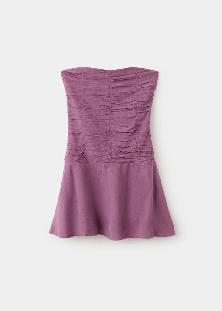Tecido fluido. Design reto. Design curto. Decote cai-cai. Painel drapeado. Fecho de fecho éclair