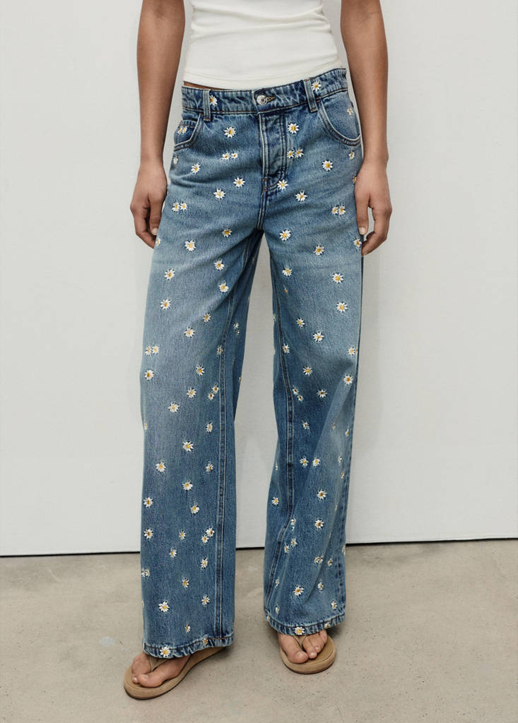 Baumwollstoff im Jeans-Stil. Langes Design. Wide Leg Design. Blumenstickerei. Mittlere Bundhöhe. Fünf Taschen. Reißverschluss und Knopfverschluss. Gänseblümchenstickerei. Gürtelschlaufen. Vorderer Verschluss mit Knöpfen. Wide-Leg-Design