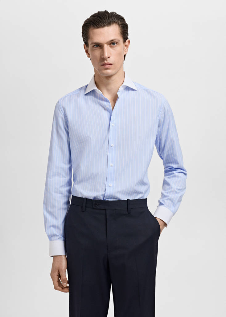 Slim Fit. 100 % Baumwolle. Muster: Streifen. Haifischkragen. Vorderer Verschluss mit Knöpfen. Lange Ärmel mit Knopfmanschetten