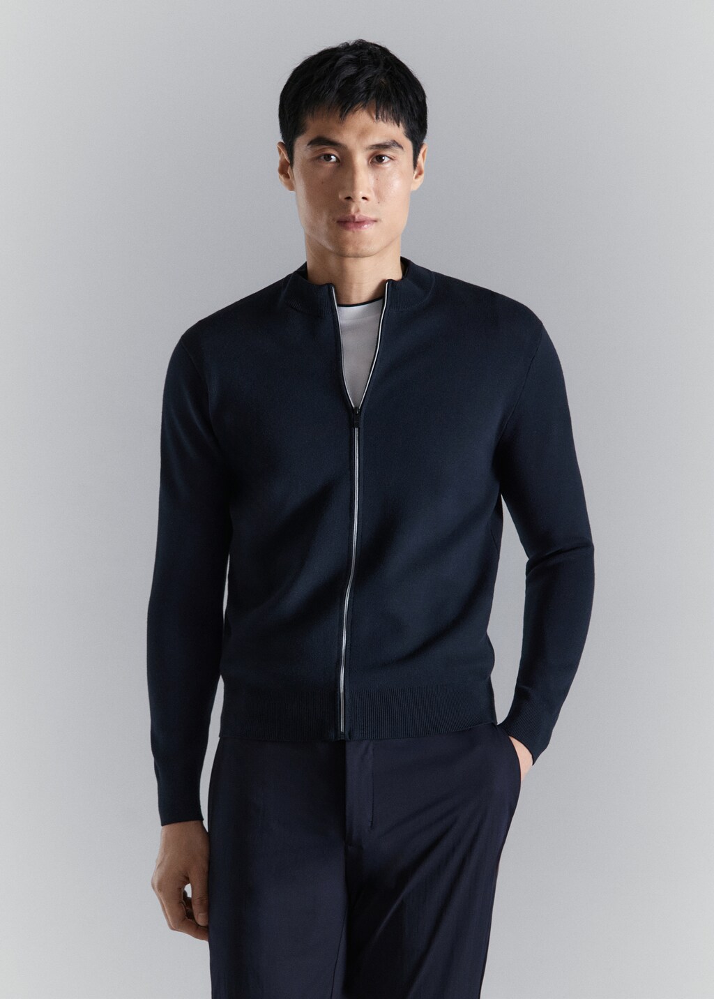 Performance-Kollektion. Comfort Stretch: Stretch-Stoff für zusätzlichen Komfort. Mittlerer Strickstoff. Regular Fit. Gerippter Kragen. Lange Ärmel mit elastischen Bündchen. Reißverschluss. Gerader Saum mit gerippten Abschlüssen.