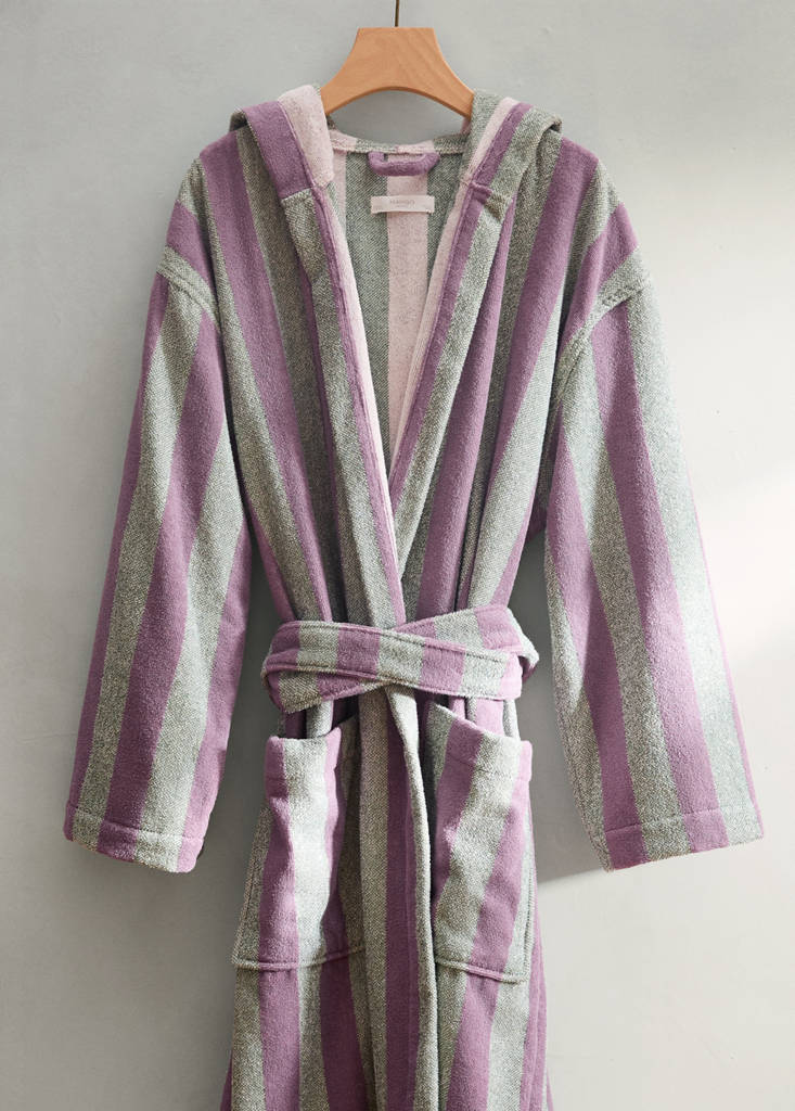 Dicker Baumwollstoff. Gewicht: 450 g/m2. Verstellbares Band. Streifendesign. Mit Kapuze. Das moderne Design wertet jedes Badezimmer auf und vereint weiche Textur mit hoher Saugfähigkeit. In zwei Farben erhältlich. Kombinierbar mit weiteren Produkten der Kollektion