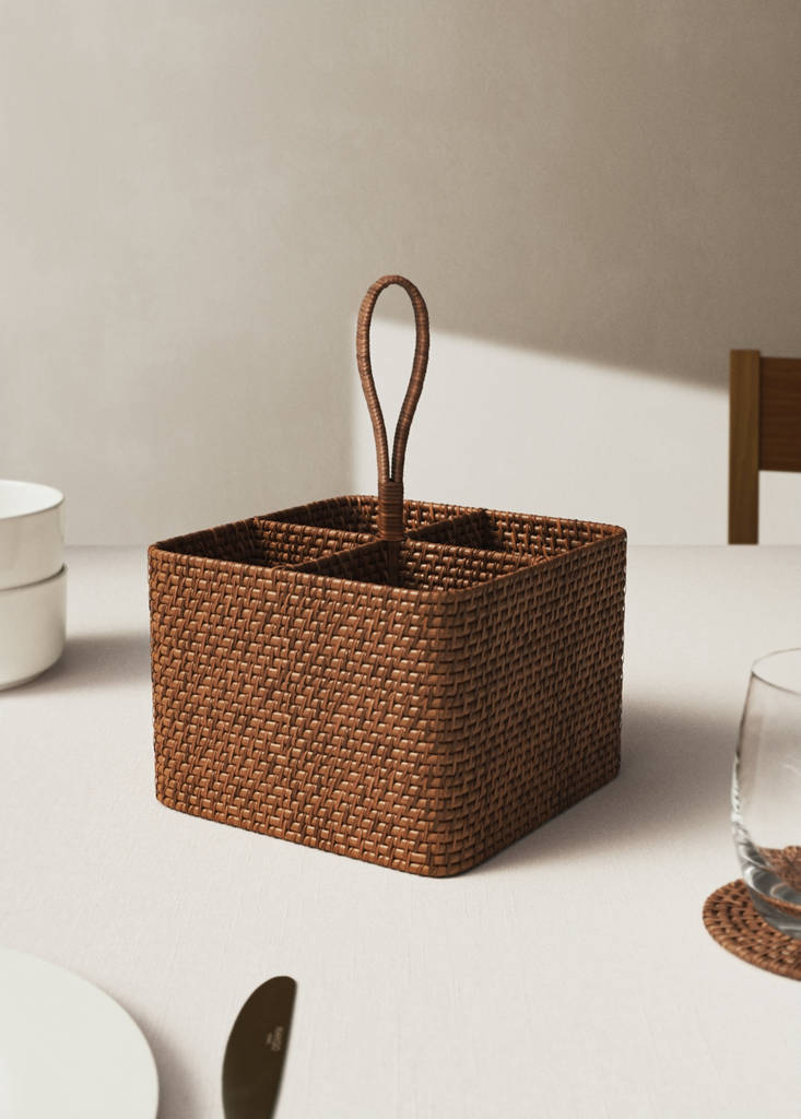Korb zur Aufbewahrung von Küchenutensilien. 100 % Rattan. Größe: 20 x 14 cm. Höhe: 13 cm ohne Henkel und 19 cm mit Henkel. Vier Fächer. Kurzer Riemen. Flechtdesign. Kombinierbar mit weiteren Produkten der Kollektion