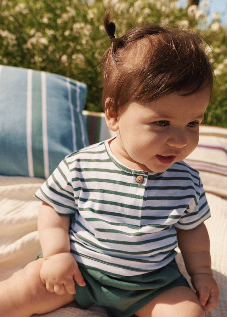 Dieses Kleidungsstück aus 100 % Baumwolle besticht durch einen geraden Schnitt mit Streifenmuster. Es verfügt über einen Rundhalsausschnitt, kurze Ärmel und eine Knopfleiste am Kragen