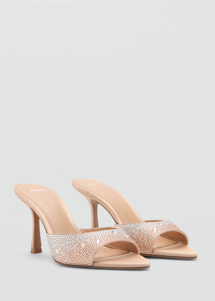 Sparkled appliqué. Open toe. Stiletto heel. No Fastening. 8 cm heel. Slingback design