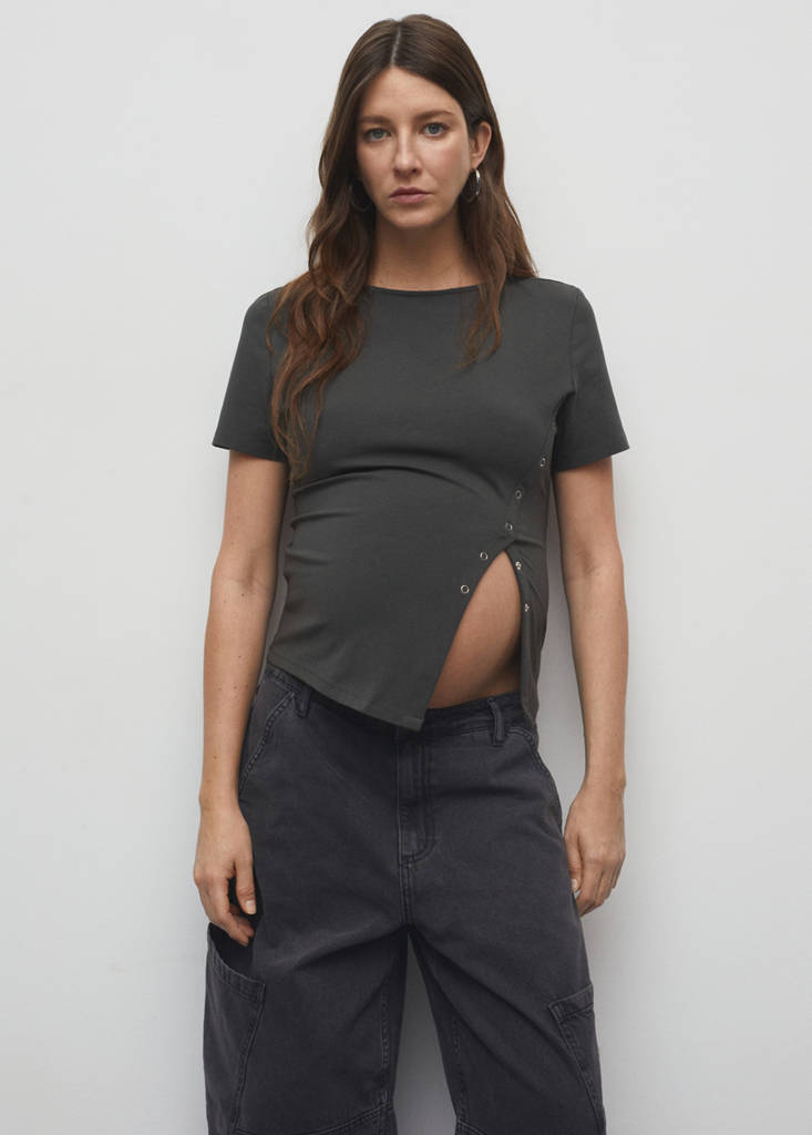 Cotton t-shirt with slitCurrent price [$ 45.95 ]$ 45.95Select a colourCharcoalSelect your sizeXSNot available. I want it!SNot available. I want it!MNot available. I want it!LNot available. I want it!XLNot available. I want it!MeasurementsNotify meAdd to WishlistSee lookFree delivery to storeCotton blend fabric. Straight design. Round neck. Short sleeves. Side slit. Metallic clip fasteningDetails, composition and careStore availability